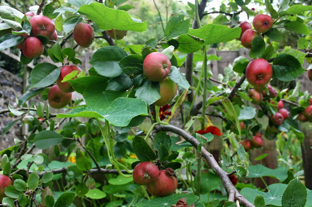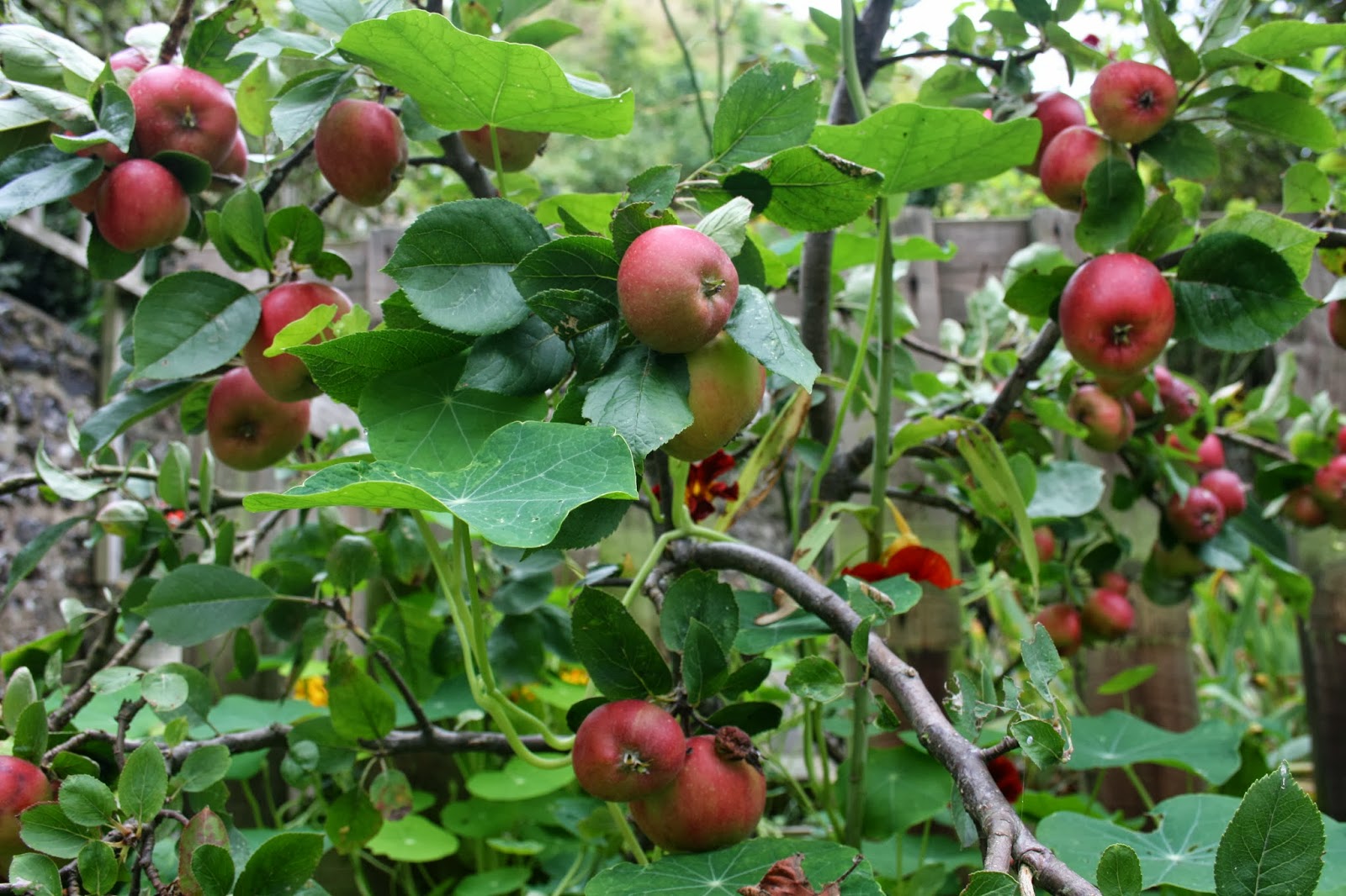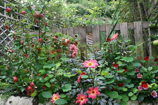 I’m enjoying the mix of little red apples and dahlias with a sprinkling of crimson nasturtiums. I’ve always tried to conjure an illusion of jungle-wildness in my gardens while maintaining discrete control.