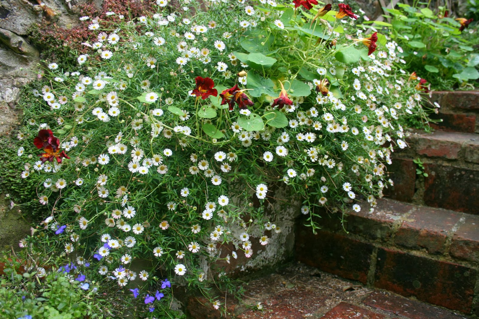 The daisies are mood enhancers too at this time of year. They start flowering in late spring and cary on until the frosts. They’re patients companions too for their wayward nasturtium neighbours.