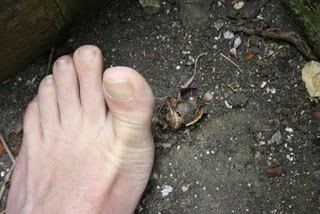 We have a lot of snails here in Lewes in the UK, and this barefoot gardener is now immune from the squeamishness that first accompanied splatting them. Today’s handy gardening tip: if you are barefoot then the gunge doesn’t mess up your shoes. Anyway this particular snail has been, er, immortalised in my poem Crushed.