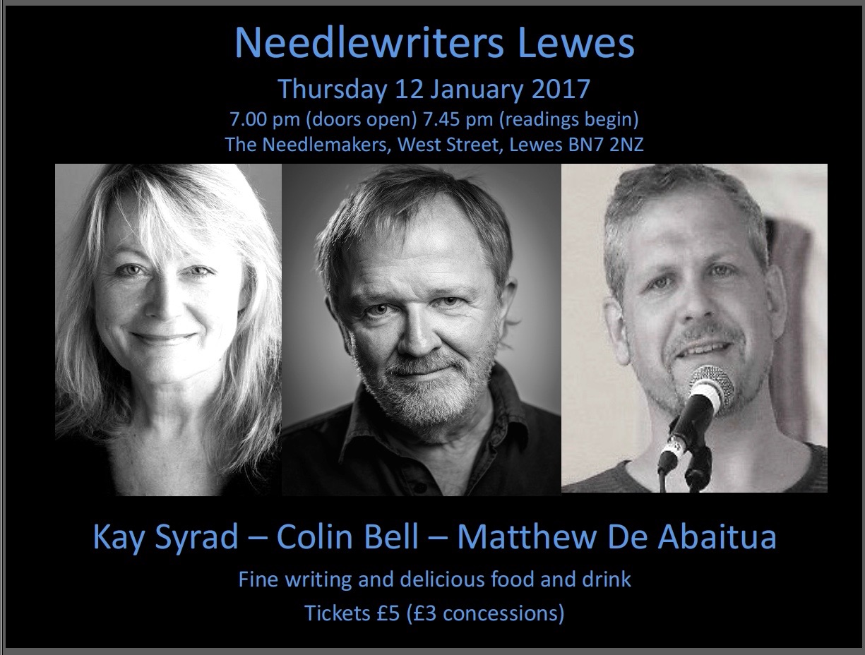 The reading will take place at the Needlemakers in Lewes, the splendid quarterly literary event where I was invited to read from my first novel too. I’m lucky to be sharing the billing with a friend, the novelist and poet, Kay Syrad and science fiction author Matthew De Abaitua. It should be an entertaining evening.