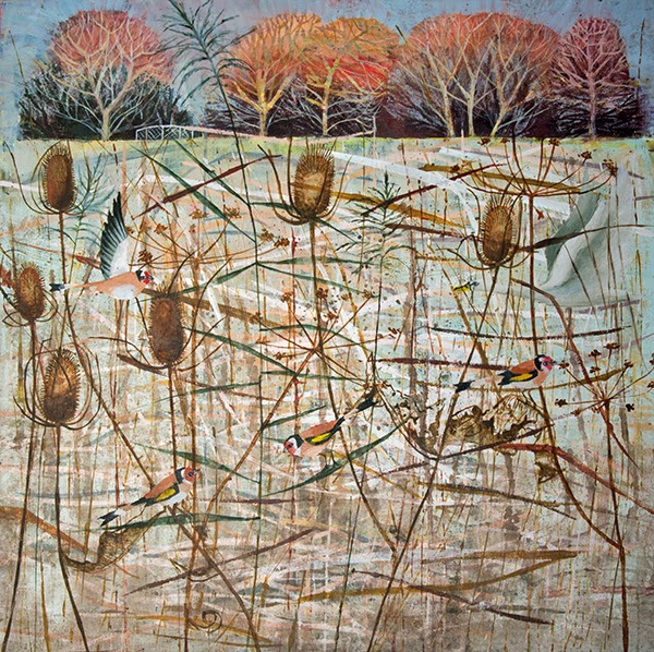 I have one of Dawn’s paintings on my living room wall and I’m lucky to be able to look at it every day. It depicts, in Dawn’s very distinctive style, a red dawn in November on the Railway Land Nature Reserve. Dawn’s work is an intriguing mixture of landscape and intense close-up which mixes realism and reductionism with near abstraction. It’s a style that reveals something new no matter how many times you return to look.