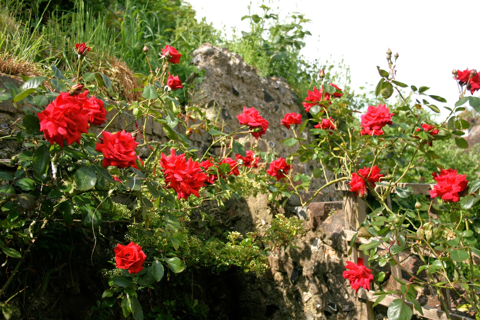 This is Danse de Feu (Fire Dance), one of my David Austen roses. It has burst into flame this week in its unlikely place at the darkest part of my small Lewes garden on the mostly shadowy North facing flint wall. It is well-named as it lights up this sun-starved corner with its lively bursts of fire.