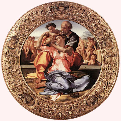 Michelangelo, of course was made of sterner stuff and he is represented in the Uffizi by his most famous painting where the Madonna is no Florentine lass but a monumental and rather formidable woman with the cares of the World on her shoulders. Is Joseph passing the Messiah to her or is she pushing him back? Whatever is going on here, it is a difficult and more complex world than that inhabited by the langourous nudes that are slouching around behind their backs.