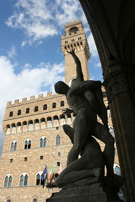 The Rape of the Sabine Woman by Giambologna (1529-1608) with its dramatically upward surging pyramid of bodies is just one of the fine statues that are crammed into the famous Piazza Della Signoria, Florence’s main square.