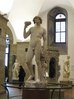 After a night of a few too many carafes of red wine, what better than to view, through slightly blurry eyes, Michelangelo’s wine god sculpture Bacchus who lurches precariously and lasciviously on his narrow stand. Apparently, this good-time god was the best endowed of all Michelangelo’s nude male statues but, early in the Sixteenth Century his member was broken off. I suspect jealousy.