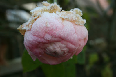 The pink roses have taken on the look of a delicious frozen dessert best served with a glass of Sicilian Marsala after a hearty dish of roast venison in front of a crackling log fire.