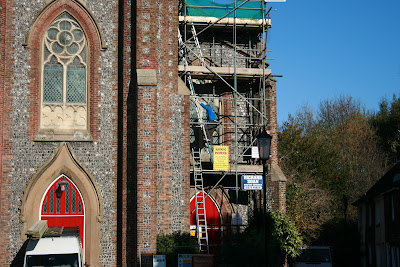 Down the road, the picturesque church of St John Sub Castro has got the scaffolders too….