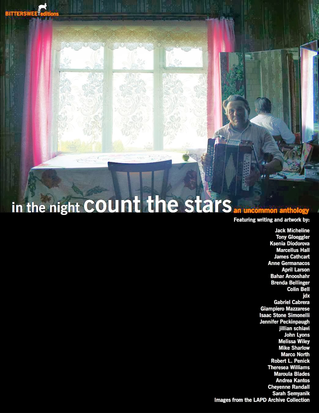 “The stories and images thrive independently, each defining “in the night count the stars” in their own way. In addition to well-crafted short stories and a stunning photo essay of rural Russia, there is a portentous restaurant receipt; a love letter; a mantra; a redacted document; a judicial order; a crime scene photograph. Many of the contributors hail from surprising origins – a court clerk, an oral surgeon, an expat, an assisted living worker and an Italian forest worker alongside well-established authors and artists, all juxtaposed with a celebration of their rough edges. Their differences deliver rare insights, often a revelation.”
