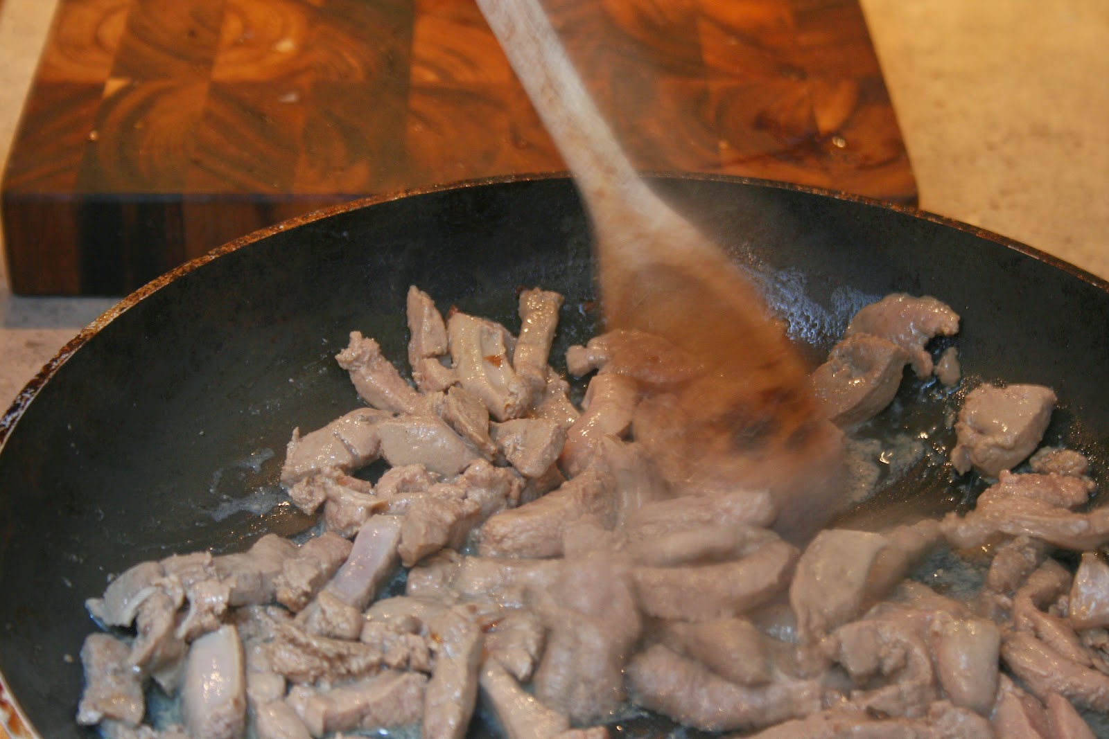 After the 45 minutes was up, I heated up some butter (8g.) and another tablespoon of olive oil and when it was sizzling, I added the liver.