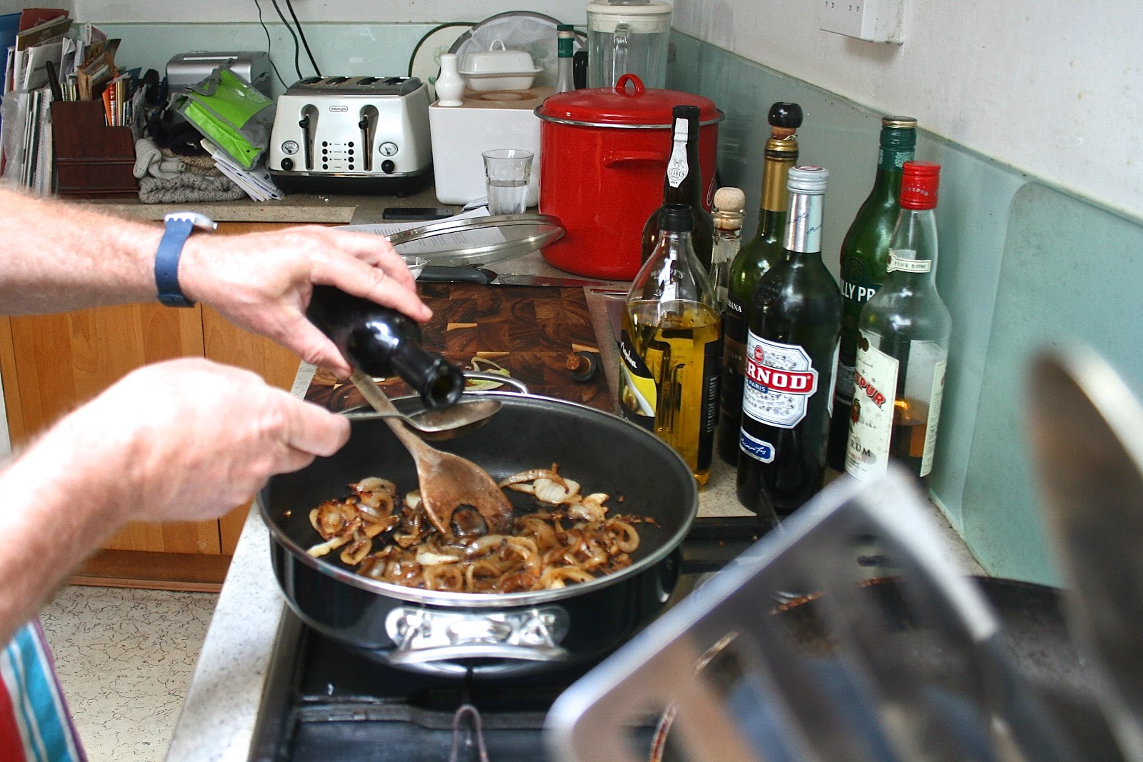 There was another meet of the Lewes Men’s Pie Club over the weekend. Here are the members – my friends (from left to right) Martin, Adam, Rob, Harvey and Dave. I’m not in the photograph because, well yes, I was behind the camera. We haven’t met this year until now so it was great to be back together again balancing my lack of culinary skills with the ambitious successes of most of the others. It was agreed – and then forgotten – that we would do offal this time instead of pies so, in the end, I was the only one to break the pie tradition. I blame my recent trip to Venice where I tasted the Venetian speciality, Fegato alla Veneziana – calves livers with caramelised sweet onions. I loved it then and was determined to revive the taste here in Lewes UK. I’m not claiming full authenticity so let’s call my effort, Lewes Liver. As you may have guessed, Lewes Men’s Pie Night (membership by invitation only) is all about drinking but let’s not go there.