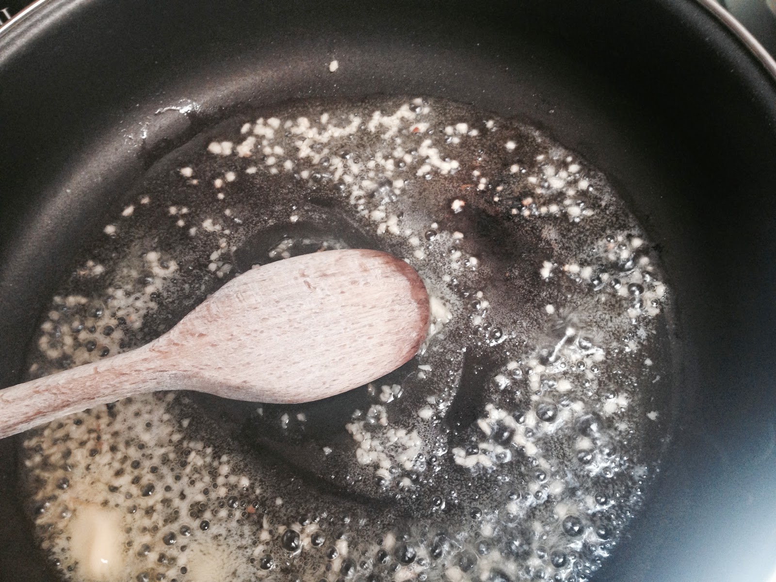 I heated a pan with a tablespoon of olive oil, a knob of butter and one garlic chopped and crushed.