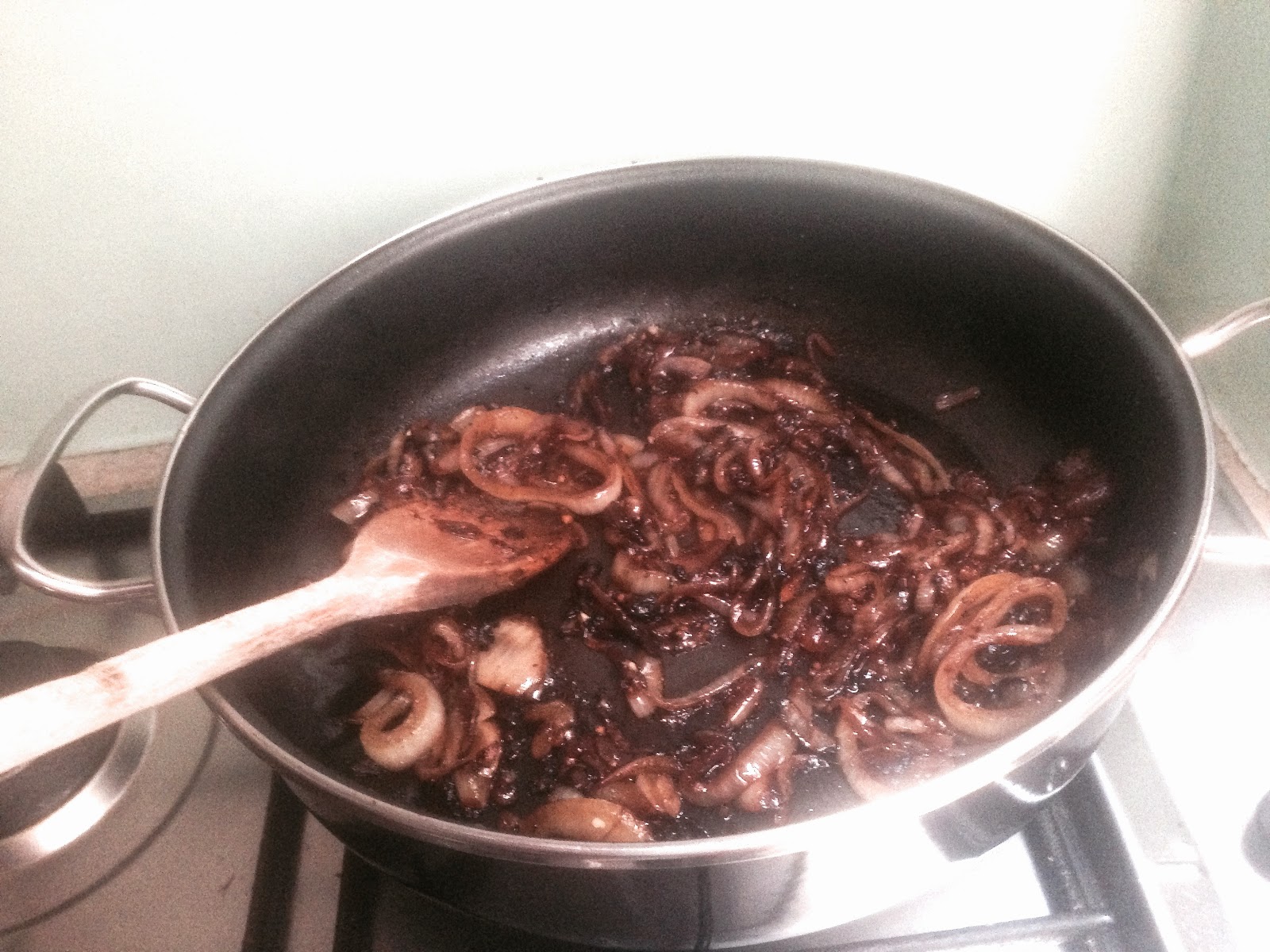 This was done on a fairly high flame for about ten minutes when the onions start to go brown with black edges.