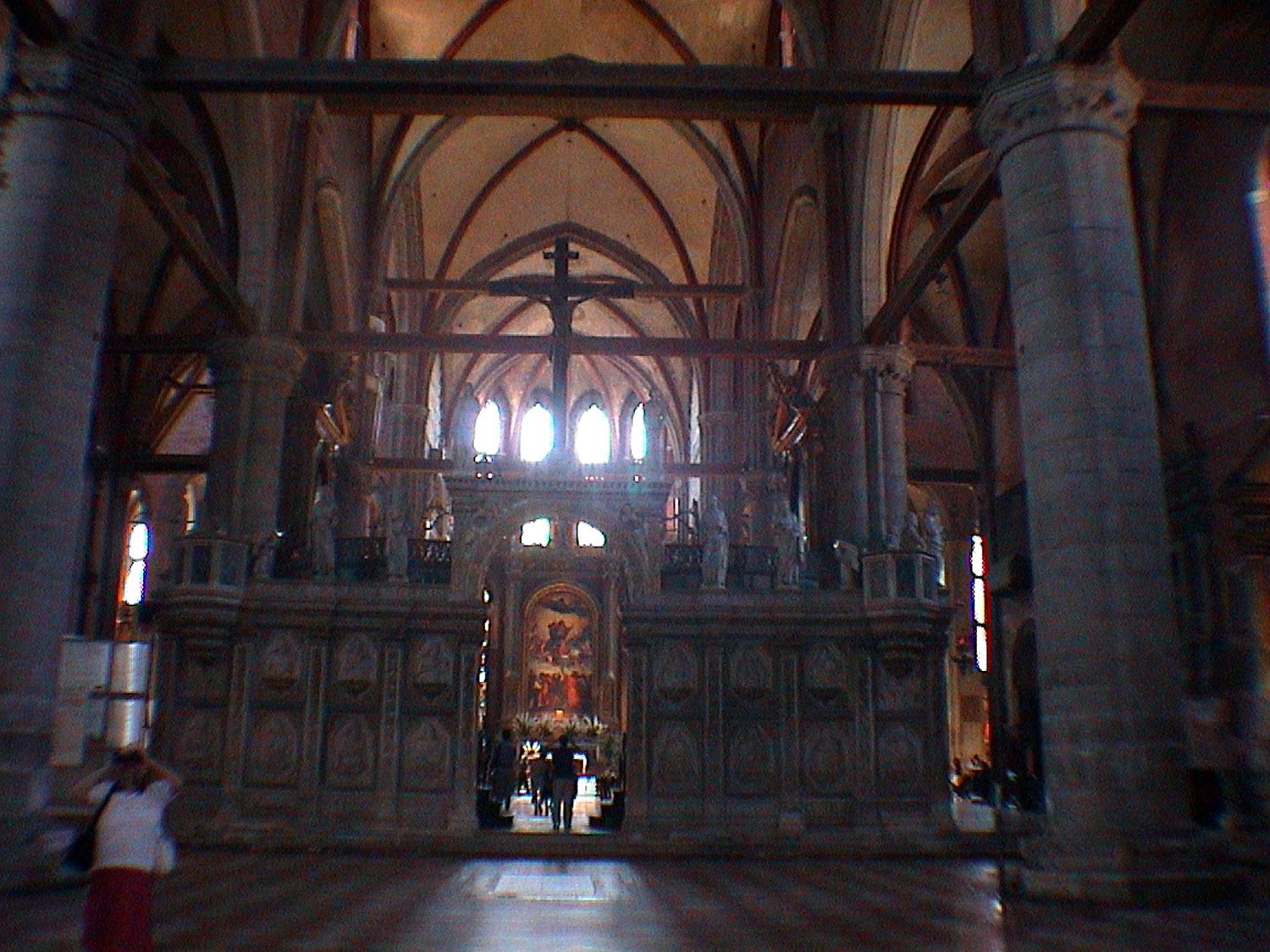 There were two people inside this vast and awe-inspiring building which had plunged me into darkness as I stepped in from the blazing sunshine outside. I had read in my guidebook that the Venetian painter Tiziano Vecellio (c. 1488- 1576), better known as Titian, had once painted an altar piece for this church but I assumed that it would have been packed off to a major art gallery centuries ago but, no, there it was. Titian’s Assumption of the Virgin Mary, in its original setting, in a church that I nearly passed by.