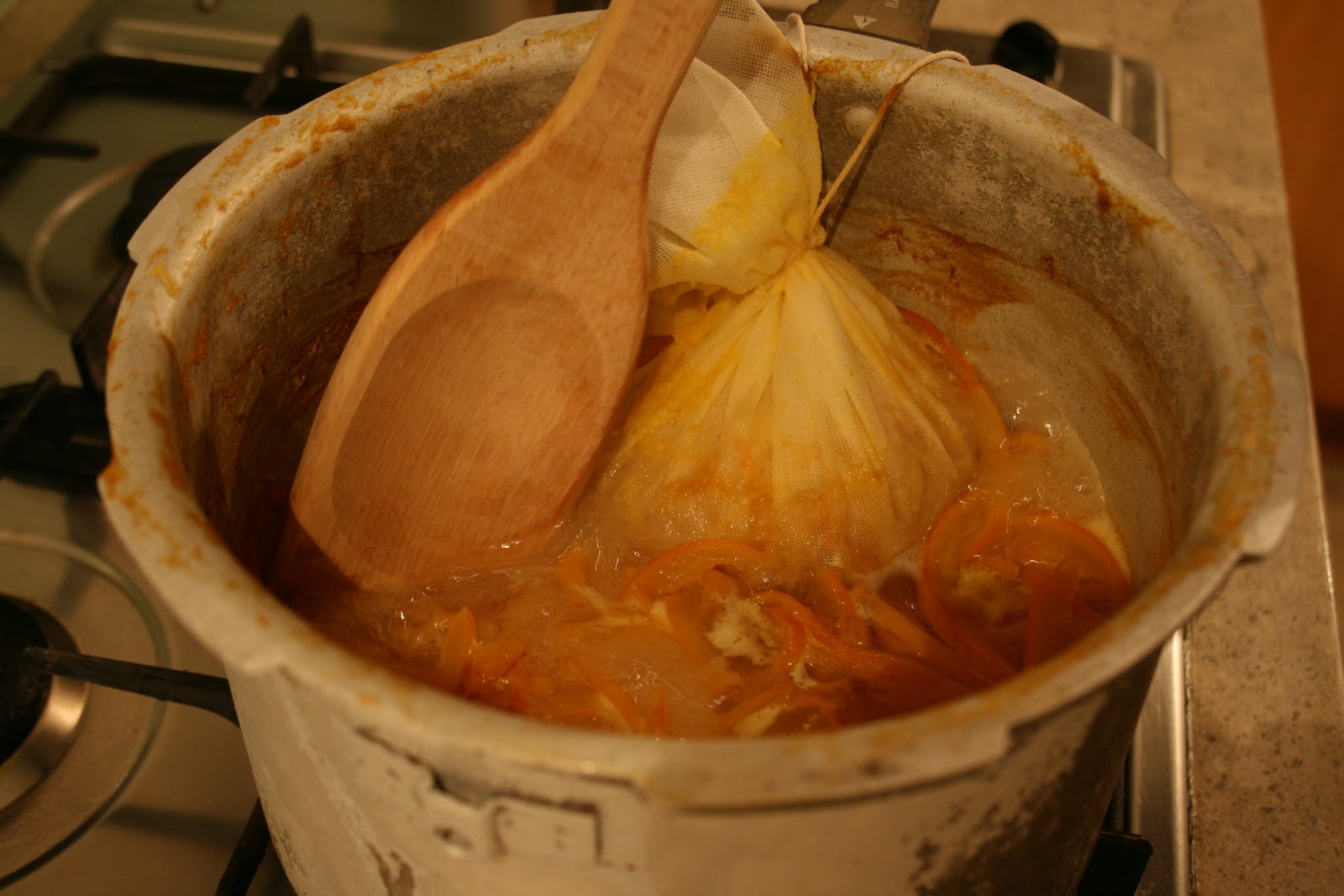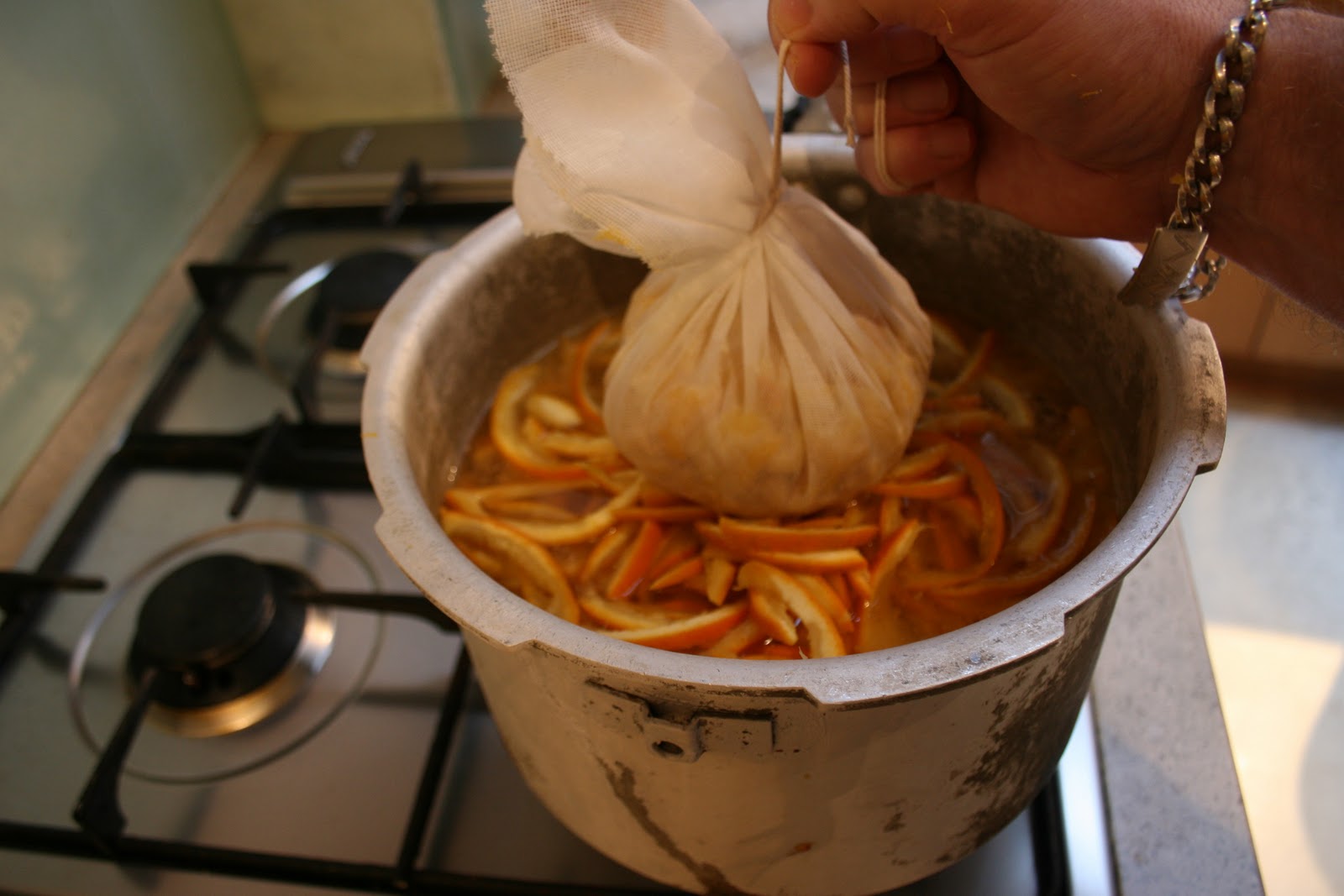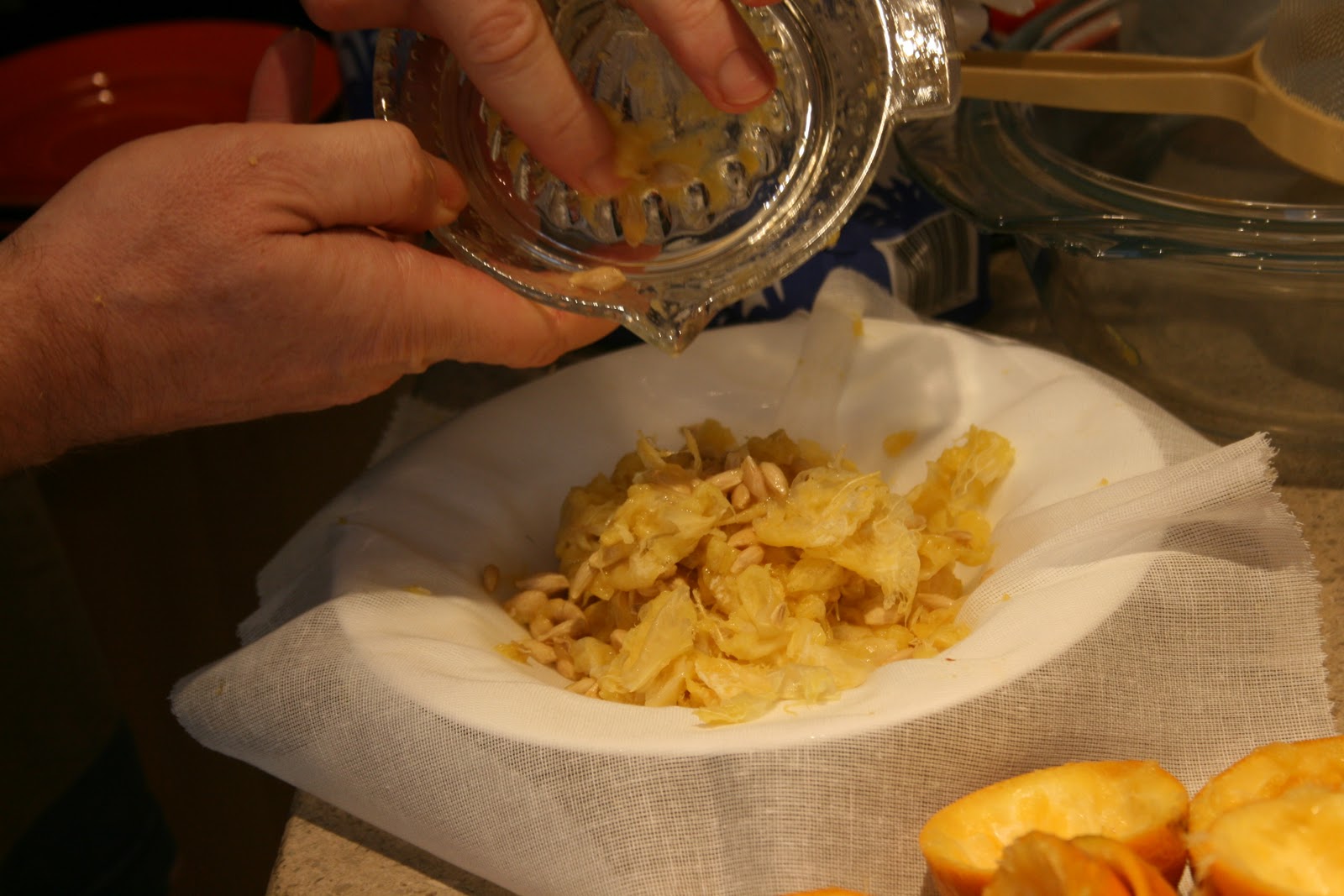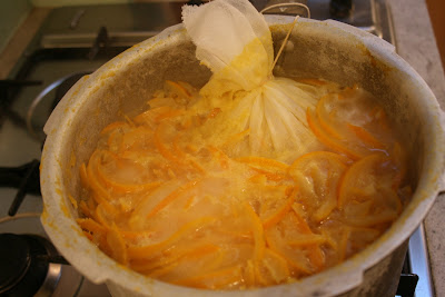…put the pips and pith onto a square of muslin on a dish. This will add the pectin to the mix, the essential ingredient for setting the marmalade.