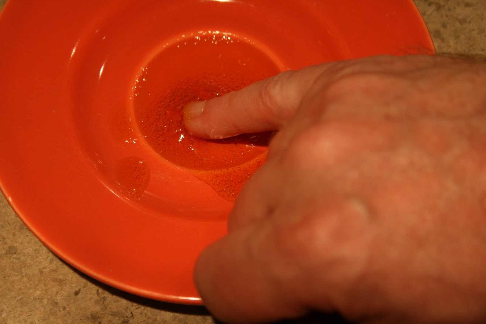 …then bring it to the boil and keep it bubbling away for fifteen minutes….you put some saucers in the fridge now so that they will be cold for when it is time to test if it is ready to set……after the fifteen minutes you spoon a little of the mix onto one of the saucers and return it to the fridge to cool. If after a short time it has a wrinkly skin when you touch it with your finger, then it is ready, if not carry on boiling for another ten minutes and so on, keep testing it on the cold saucers. Then, delia didn’t say this, lick your finger to see what your marmalade tastes like. Hmmm….delicious.