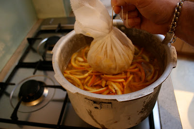 By then, the muslin bag should be cool enough to allow you to get a grip on it, squeezing its mushy contents into the saucepan……this is a wonderfully messy and highly tactile moment – enjoy!