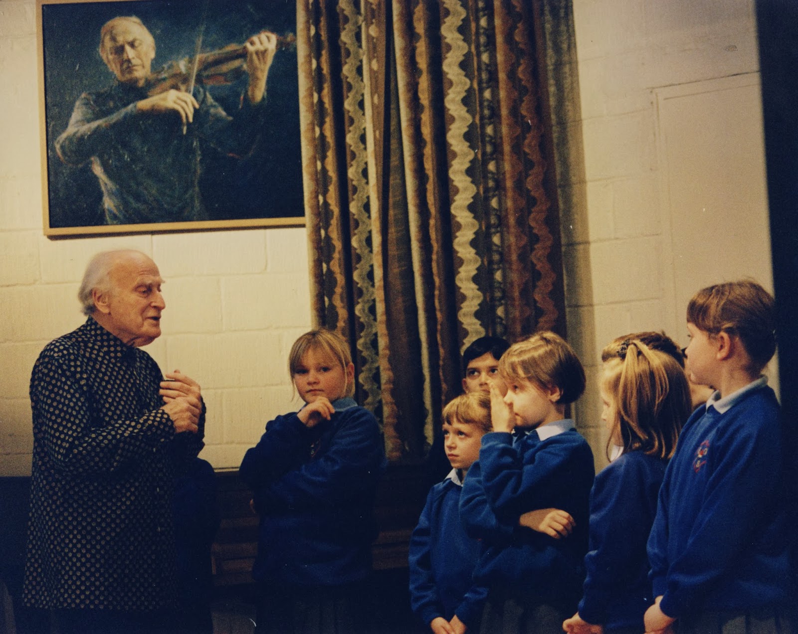 During that week that we worked together in, I think, 1990, we struck up a rapport and talked of other ways in which we could work together in the future. It was one of those conversations that led to the idea of a television documentary recording a possible project where we would select a group of children for him to teach from scratch. We developed the idea to include a British state school where music was not a specialist subject and where there was no violin teacher. Bearing in mind, the splendid Granada series 7 Up, we also decided to choose children aged 7 and to see if music really could make a difference to their lives. It took eight years to convince a broadcaster to go with this idea but eventually I got the BBC to commission it in 1998. Sadly, this was after our first generation of seven year olds had grown too old for the experiment but we started again and found a school in Guildford, Surrey and proceeded, with the expert guidance of the Russian violin professor Natalia Boyarsky, who had experience of choosing potential violinists in the then Soviet Union and who was now, and still is, a teacher at the Yehudi Menuhin School in England. There was much scepticism from school teachers and parents alike but the chance was too good to turn down the opportunity to be taught by such a distinguished musician. Yehudi was thrilled and we planned a schedule where he could come to the school once a month for a year to teach the twelve selected seven year olds. Filming started in September 1998 and, from the start, I knew that the results would be delightful and, yes, an important experiment in the value of music in schools.