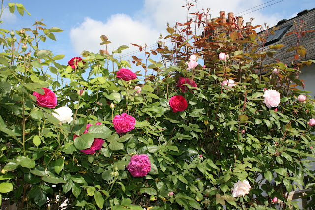 There are some red roses and some white ones there and the sky is very blue so, maybe even my Lewes garden is looking patriotic this Jubilee weekend. There is pink and yellow too so let’s not get too carried away. Maybe you should try to forget about the Diamond Jubilee for a bit and just take a quiet look at my roses trying to imagine the perfume. This year the different colours are beginning to mingle and the result, so far, is very satisfying. There are a lot of buds out there so it will only get better. Enjoy.