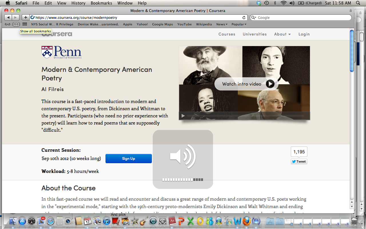 MOOC stands for Massive Open Online Course, one of the many free on-line courses run by major universities and colleges around the world but mostly from the United States. I signed up for a 10 week course in Modern and Contemporary American Poetry (ModPo) run by that iviest of Ivy League universities, the University of Pennsylvania and, quite honestly, I’m a man set on fire.