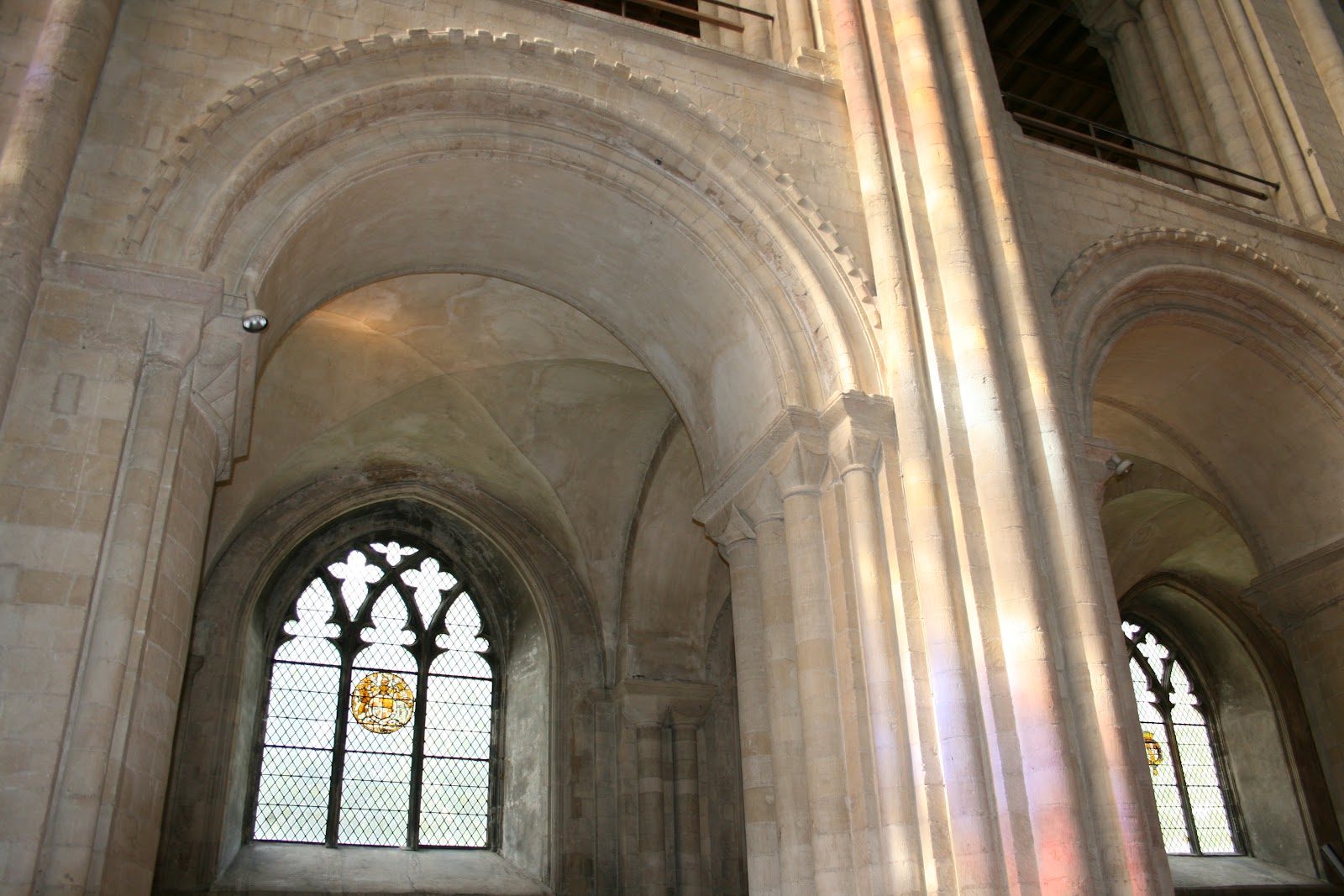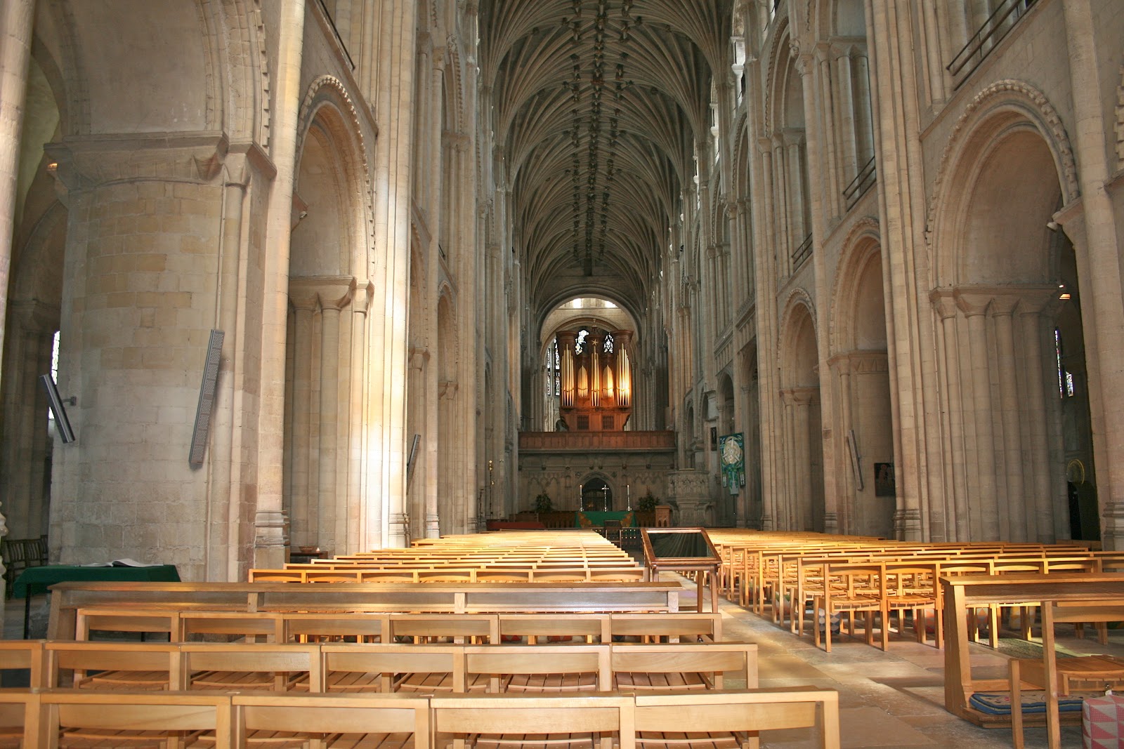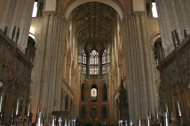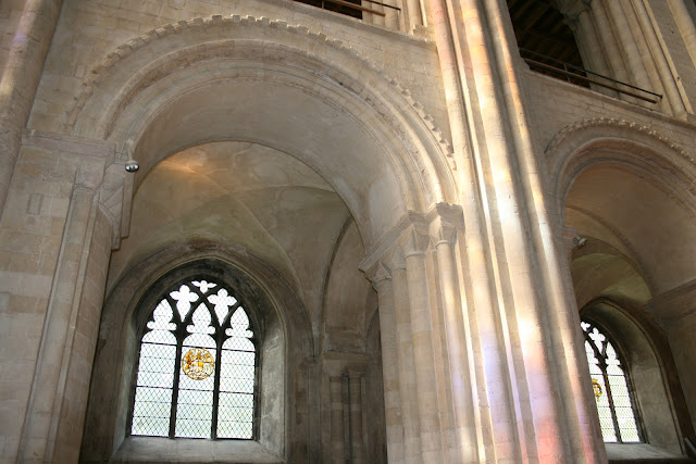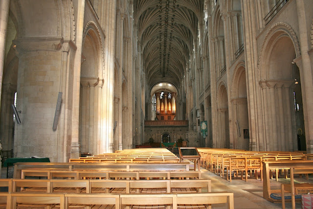 It was good enough for awhile to sit here at the back of the nave and to wonder at the architecture where the Romanesque rounded columns branch out into the luxuriant fan vaulting of the Perpendicular Gothic ceiling.