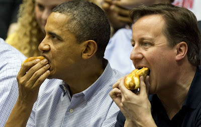 In the munching junk food on camera stakes, I think President Obama, as always, beats the hapless and terminally uncool Prime Minister Cameron.