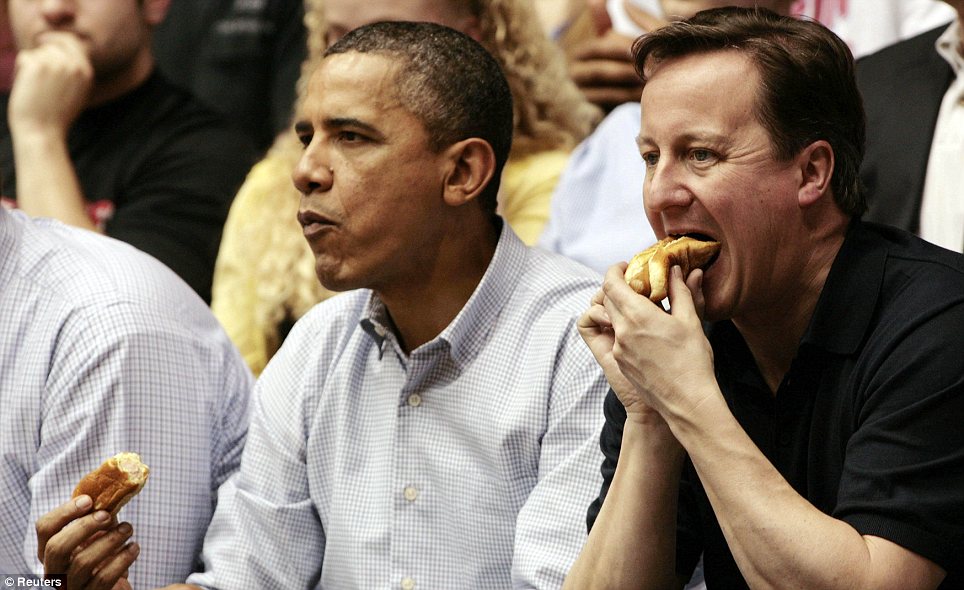 Well, they asked for it! Look away now if you have a weak stomach. The latest photo opportunity for the World’s press was to see Barrack Obama and David Cameron eating hot dogs at a basket ball match in Ohio. Thanks for that gentlemen. You must be so cool and human and electable – if you weren’t turning our stomachs that is.