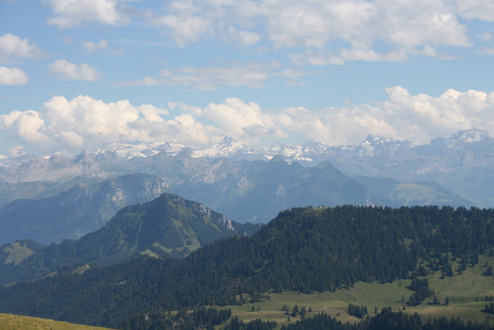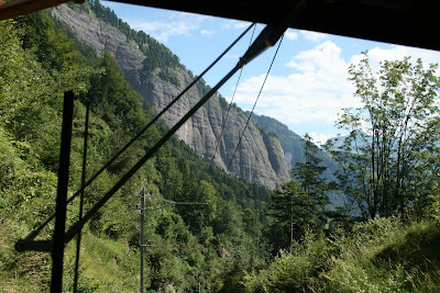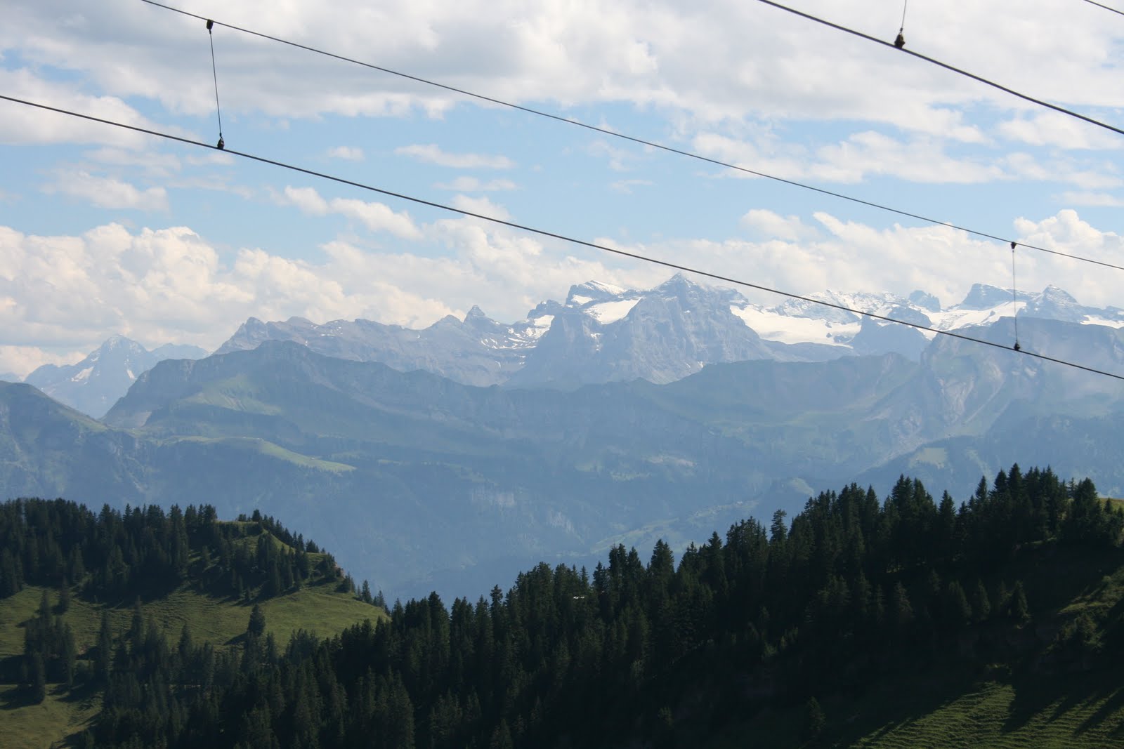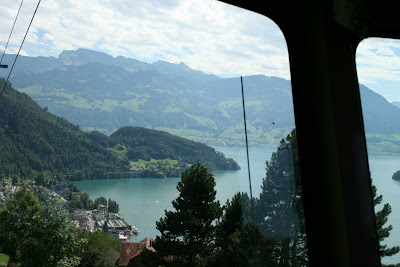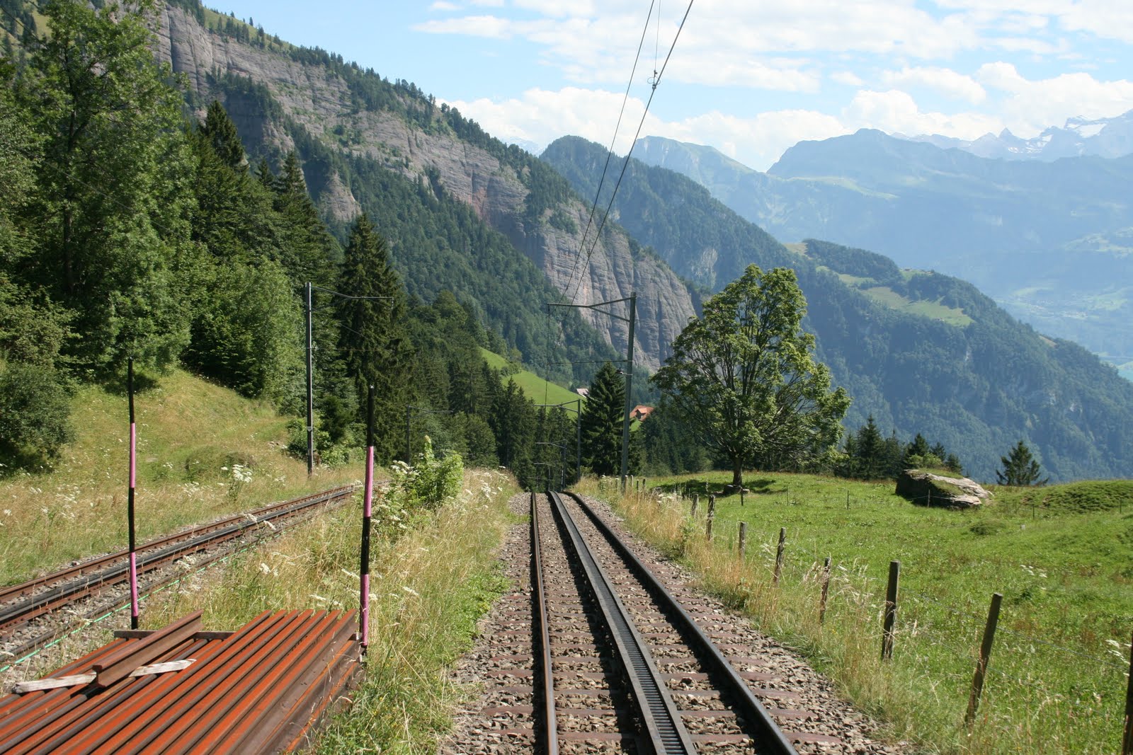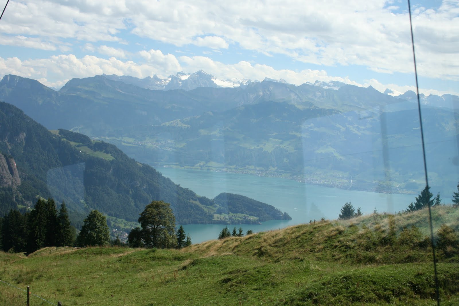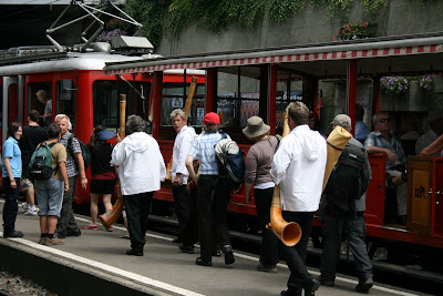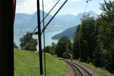 We only had time to watch whilst having lunch before we were off to catch a train. Like all good Swiss mountain train journeys we were joined by a band of guys with very long horns but it was all in the spirit of fun. This little train was pulled along on wires up the precipitous climb to the top of Mount Rigi and my relations generously arranged for me to sit in the driver’s cabin at the back where I could see the full journey in its splendour, beauty and vertigo horror.