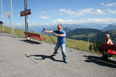 This was the view from my bedroom window when I awoke at around 5.00 one morning whilst staying in the luxurious appartment of my obsessively hospitable relations Franz and Mathilde in a small town near Zurich in Switzerland. The Zurichsee, the big lake that laps up against the well-heeled boots of some of the World’s richest businessmen reflects every shift of light as the day progresses and, if you have no pressing needs, it would be possible just to spend all day watching the scene from Franz’s balcony. I did my regular hour of taichi and kungfu practice as the day continued its dawning and then headed off with Franz and Mathilde, their nephew James and my good friend Heidi on a trip to the summit of their nearby Alpine mountain, Rigi.