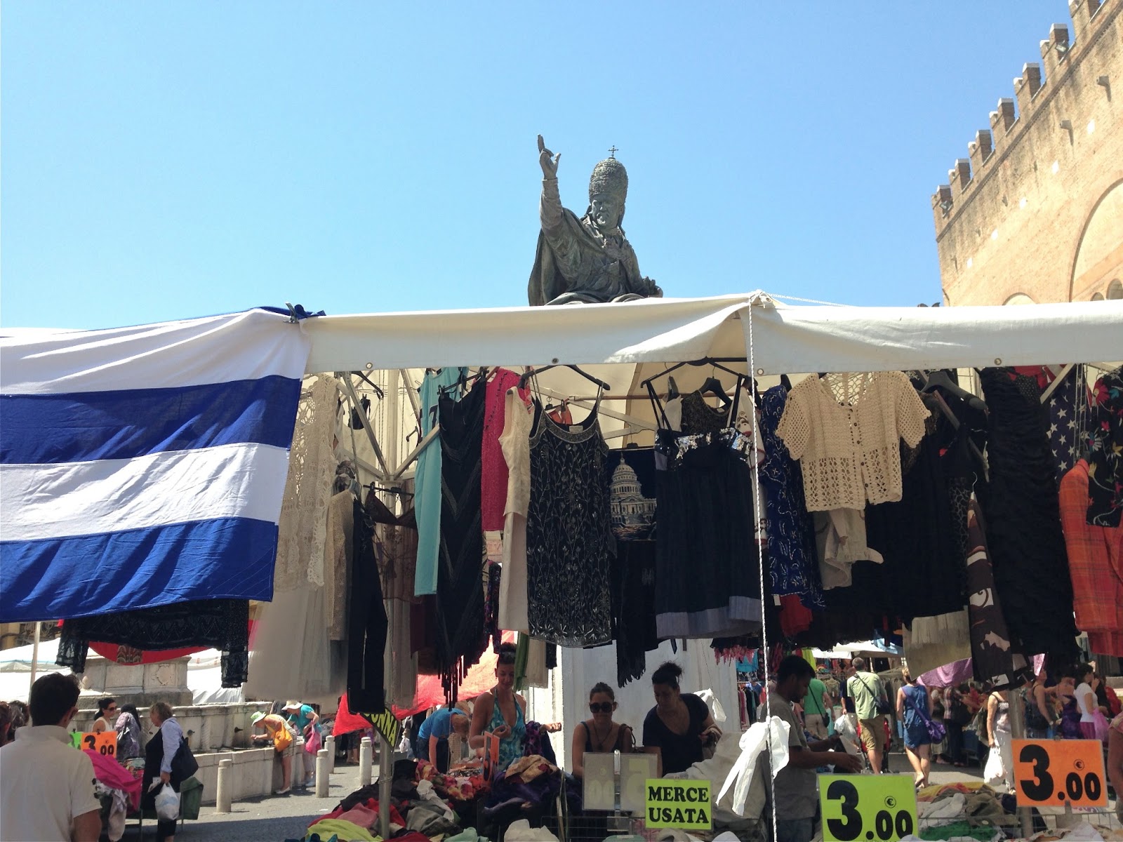 I was also impressed by the statue of Pope Paul V (papacy 1605-1621), erected in 1614, who appears to be blessing the summer frock and cardigan stall. He is best known in my home town of Lewes, in the United Kingdom, for his alleged involvement in the Gunpowder Plot, suspected of sending papal agents to undermine the luke-warm Catholicism of King James I. Every November the Fifth, his effigy is burnt at Lewes’ famous Bonfire celebrations. I think he’s a lot better off at Rimini market.