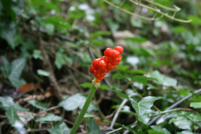 This was the woodland world of English legends. The greenwood, a place of magic, of adventure and secrecy so it is no surprize to find the evil looking berries of the wild arum glowing in the undergrowth of ivy. This plant, with its many sexually explicit folk names based on its rude appearance, is as poisonous as it looks. I am sure that it must have found its way into many a witch’s cauldron along with eye of toad and puppy dog’s tails.