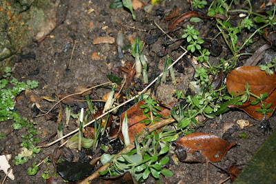 Up at this end of the garden too is a patch of golden croci (or crocuses if you insist) which are pushing their way up through the frozen soil with the determination that I admire every year in persistent winter flowering bulbs.