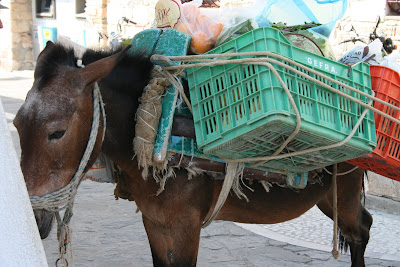 I was amazed that the dog didn’t fall off the back of the motorbike but then I realized I was thinking in a Northern European way just as I was when I saw this old vegetable merchant selling his goods from the back of his equally ancient mule. They too seem to have come from Ancient Greece and were quite content with walking pace in the age of the motor car.