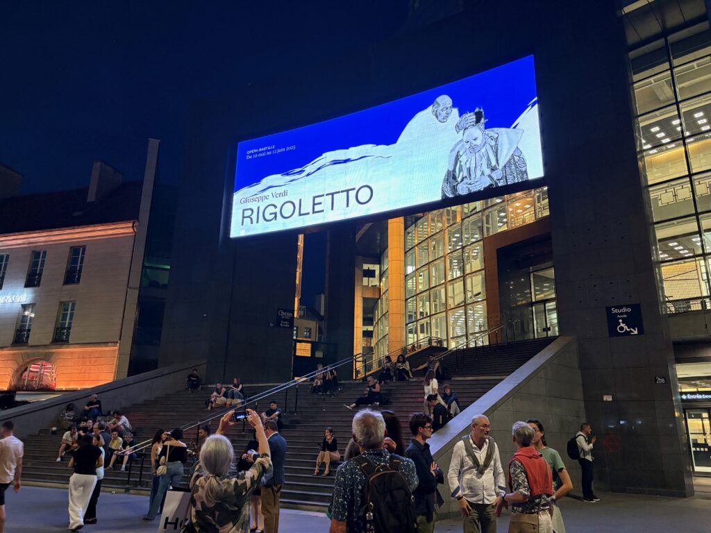 Arriving at Opéra Bastille for the first time, I was delighted to feel like a citizen in a republic and enthusiastic too that the first opera I was to see here was Rigoletto. Giuseppe Verdi’s 1851 opera based on a play by Victor Hugo, Le roi s’amuse, (The King Amuses Himself), which is about a hunch-backed Jester at the court of the King. The play was written in 1831, one year before Victor Hugo went on to write his novel Notre-Dame de Paris, otherwise known as The Hunchback of Notre-Dame. Rigoletto, the hunchback jester in Verdi’s opera is a direct descendent of Quasimodo.