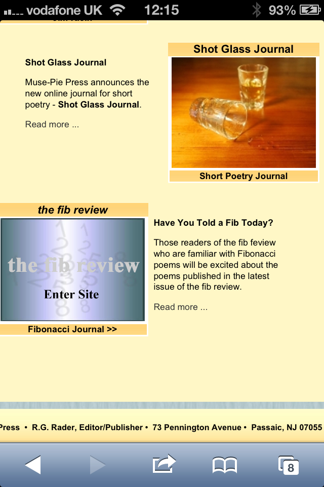 If you’re interested, kind or parient enough to read more of my Fibonacci poetry then there is an archive section too – click on Writer Archive at the top of The Fib Review #13 home page and there you’ll find all of my Fibonacci poems published since #5.